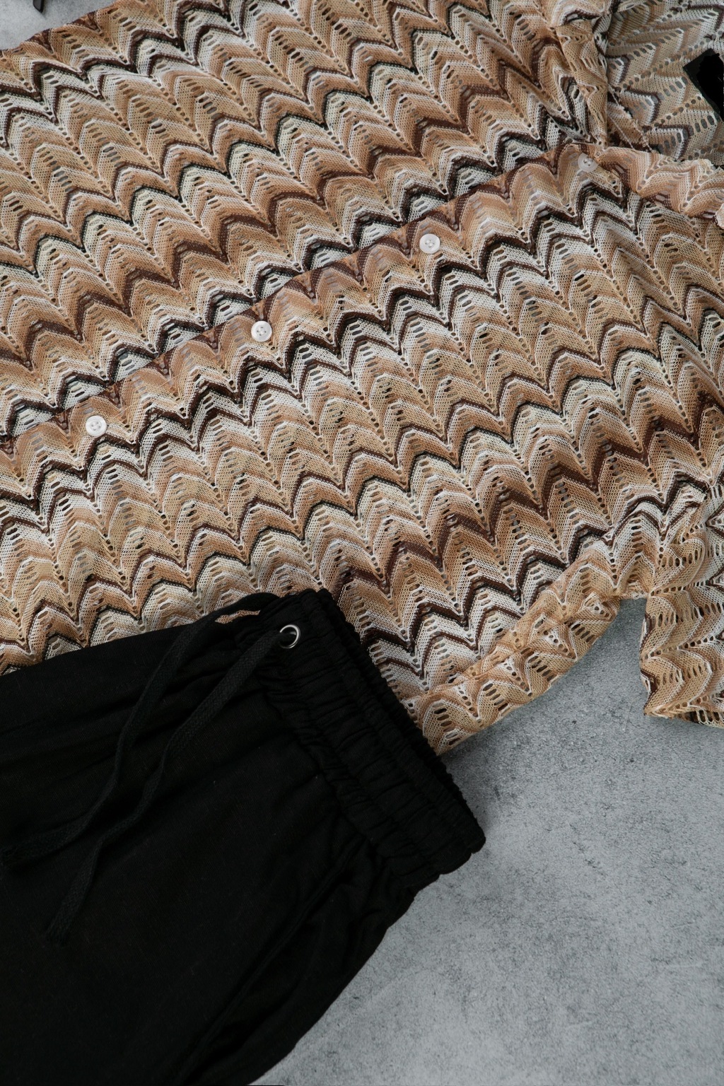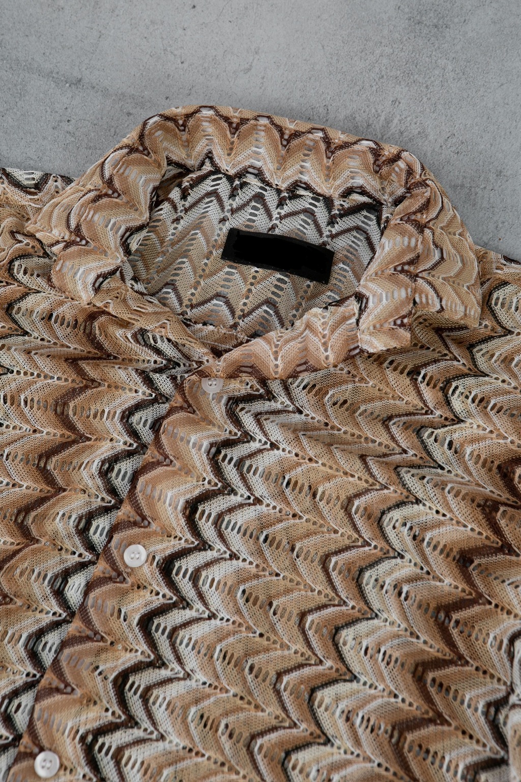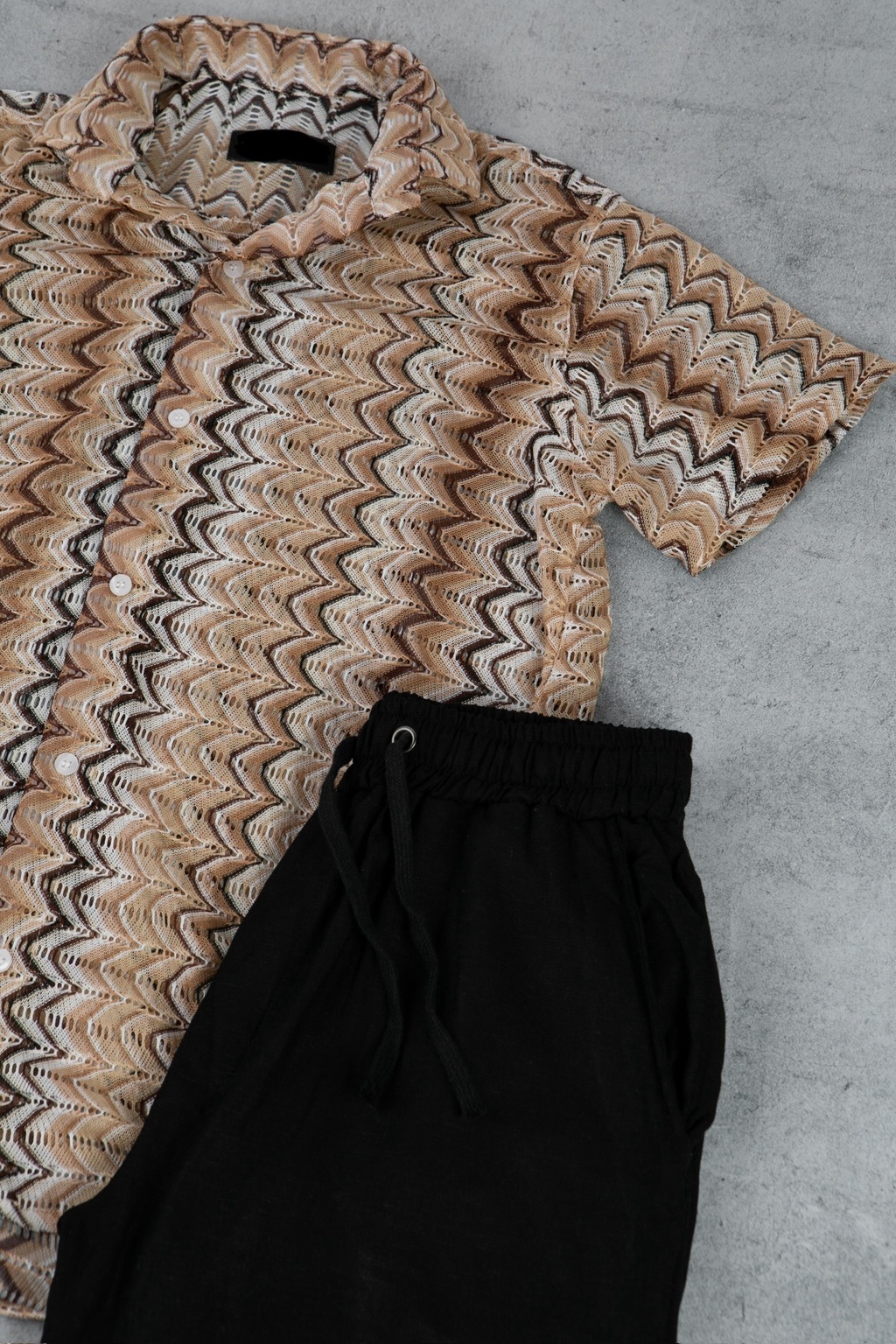 Camisa de crochet tejida, con ligeras transparencias. De colores en escala de marrones, con detalles en negro y blanco. De corte holgado y de cuello italiano. La tela es bien fresca y con muy buena textura. Tiene transparencias, lo que hace que sea una camisa unica. Ideal para combinarla con short de lino o pantalones de lino o bermudas de jean. Tu proxima prenda favorita.
