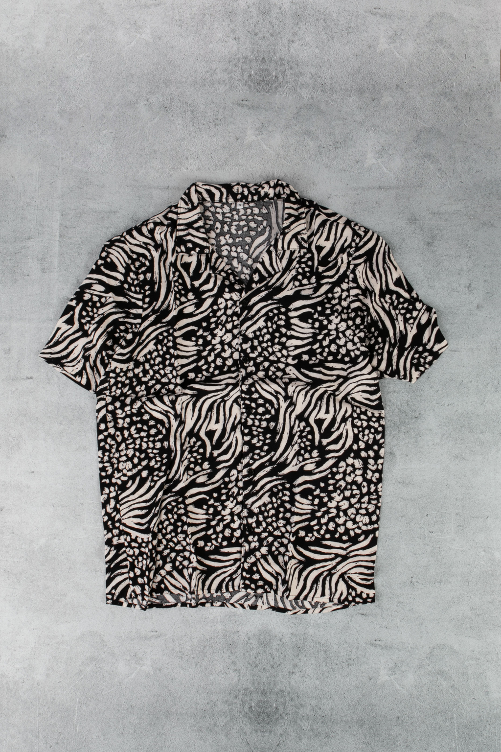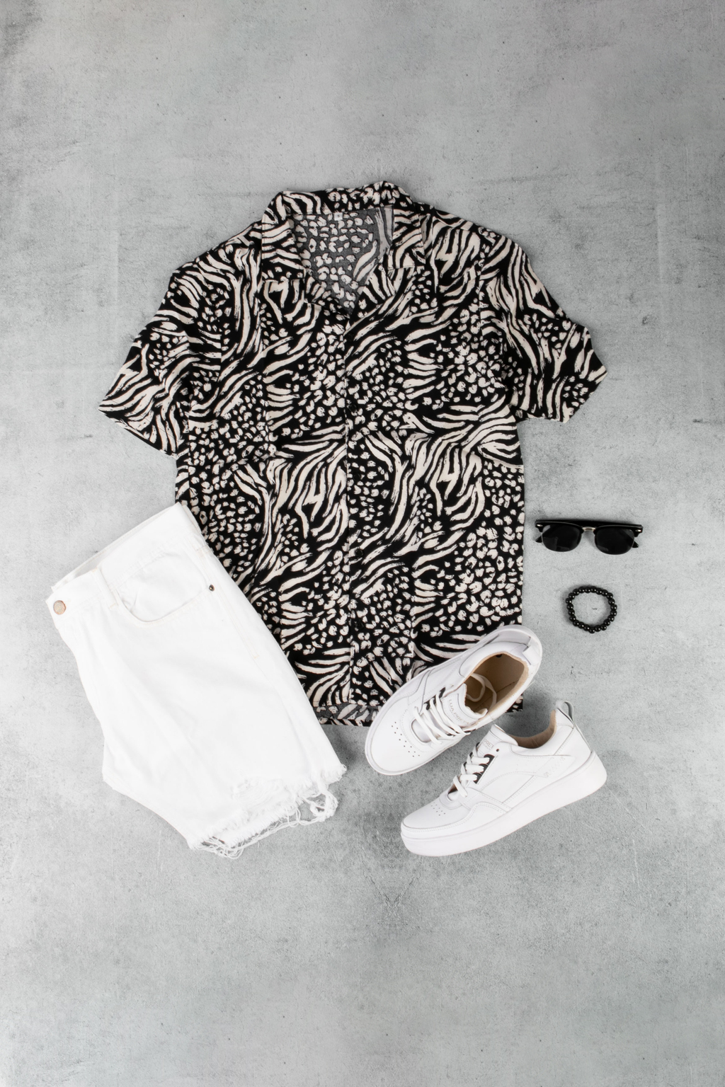 Camisa de fibrana con estampa de color negro con detalles en crudo. De tela liviana, ideal para los dias de calor. Muy comoda al uso y facil de combinar. Es una prenda ideal para esta temporada!