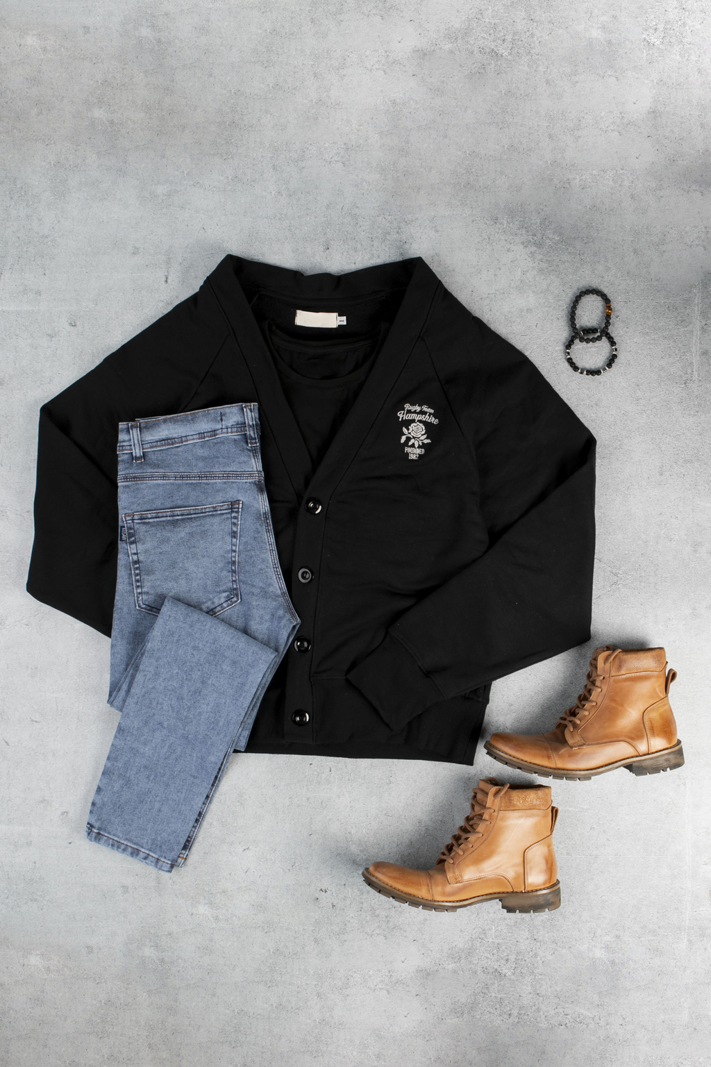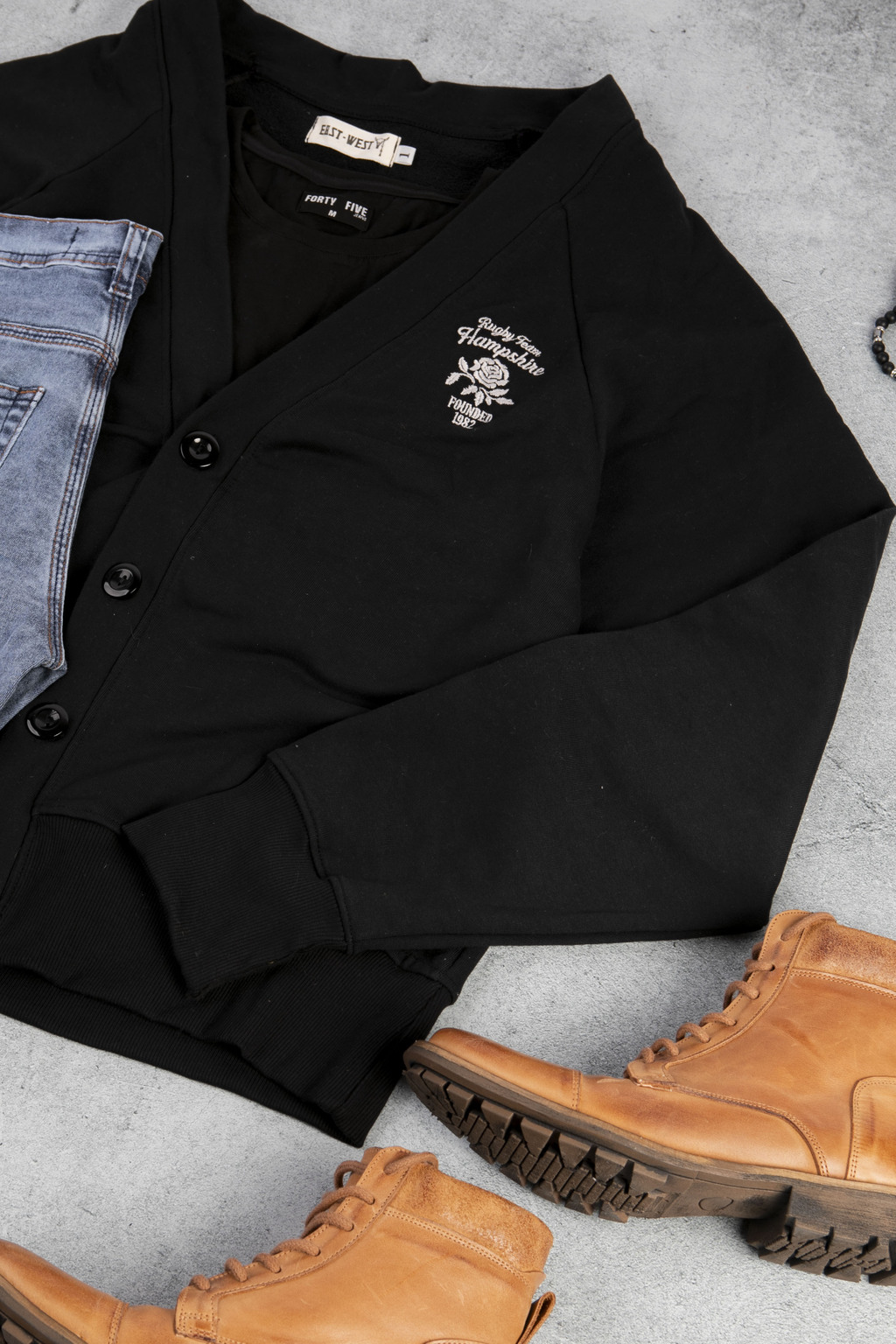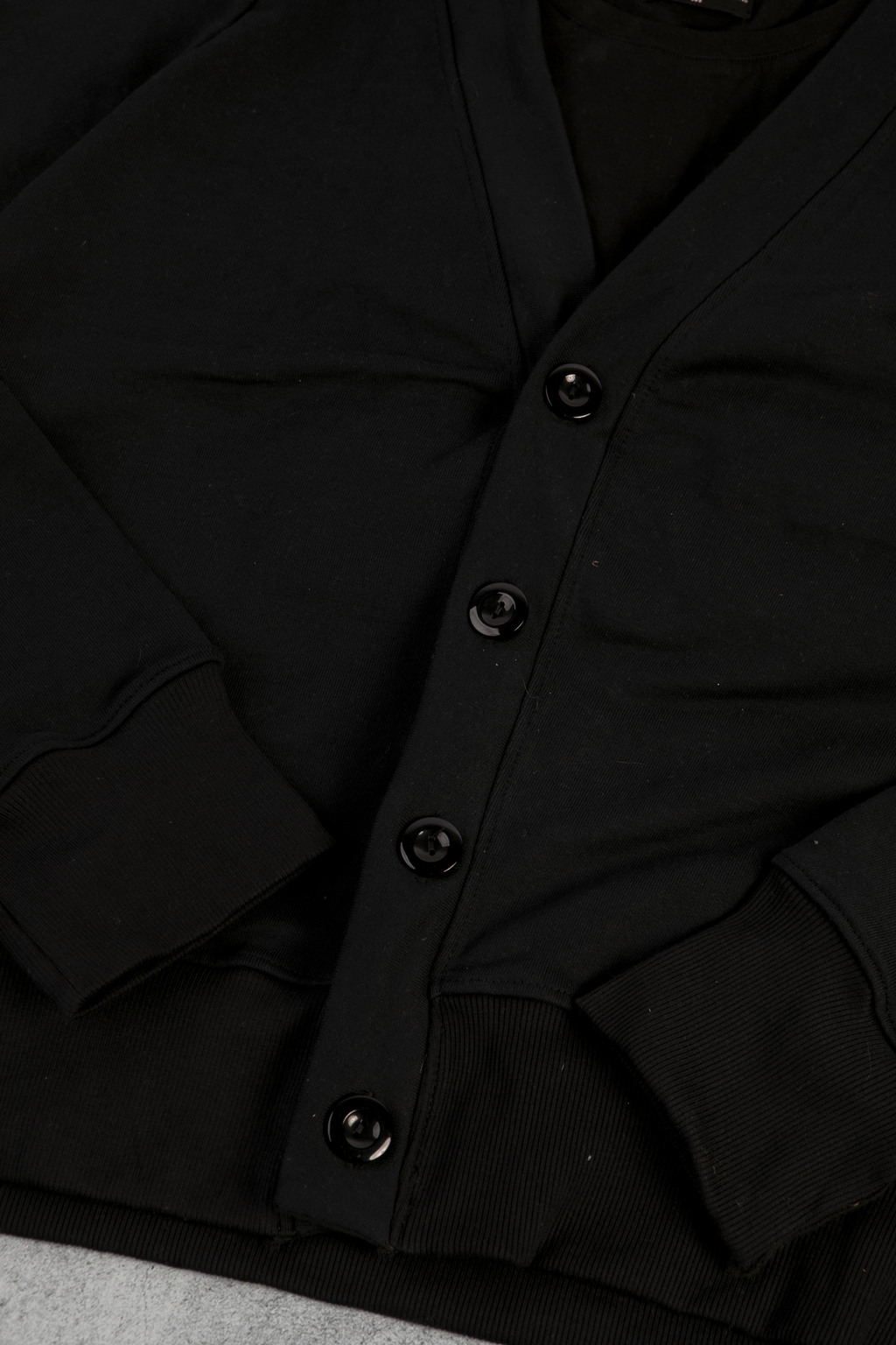 Cárdigan de de algodón rustico, de corte holgado. Es de color negro, con una textura que lo hace único. Viene con cuello abierto, y botones grandes de plástico a tono con el color del camisaco. Tiene costura de color blanca al frente y en la espalda, que genera un contraste genial. Una prenda ideal para cualquier tipo de look que elijas: casual, elegante o urbano.