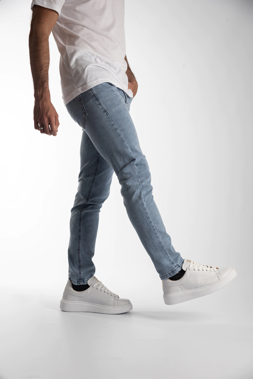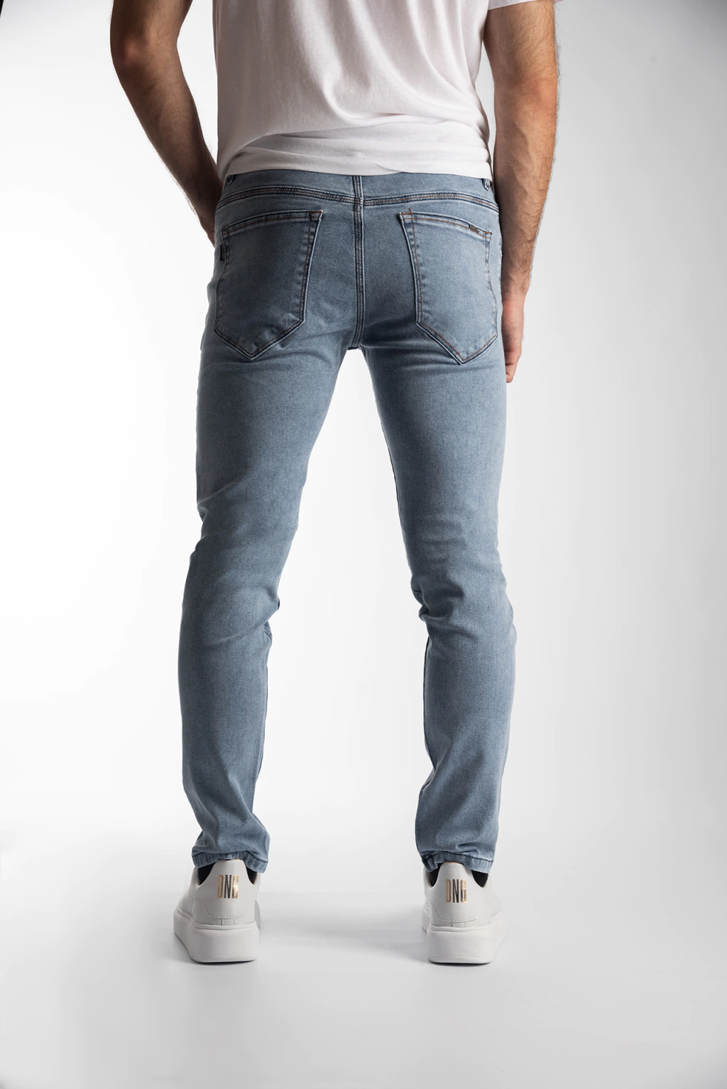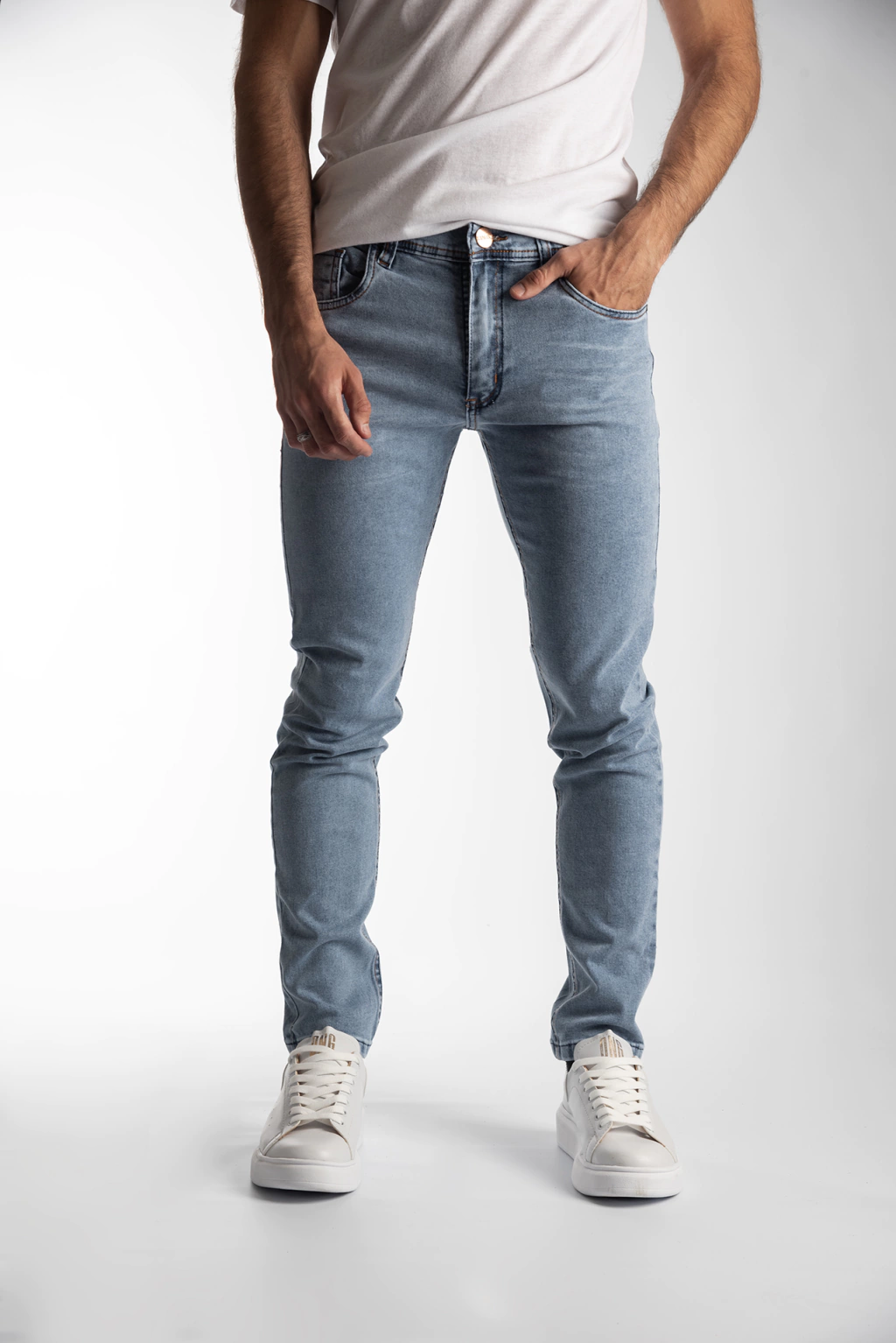 Jean semi chupin y elastizado, de color celeste claro gastado. Tiene un largo regular, viene con cremallera y boton. Posee dos bolsillos delanteros y dos bolsillos traseros. Ideal para un look formal o casual.