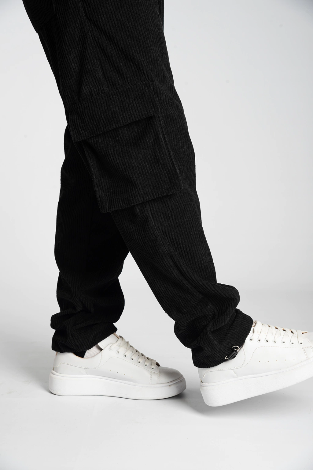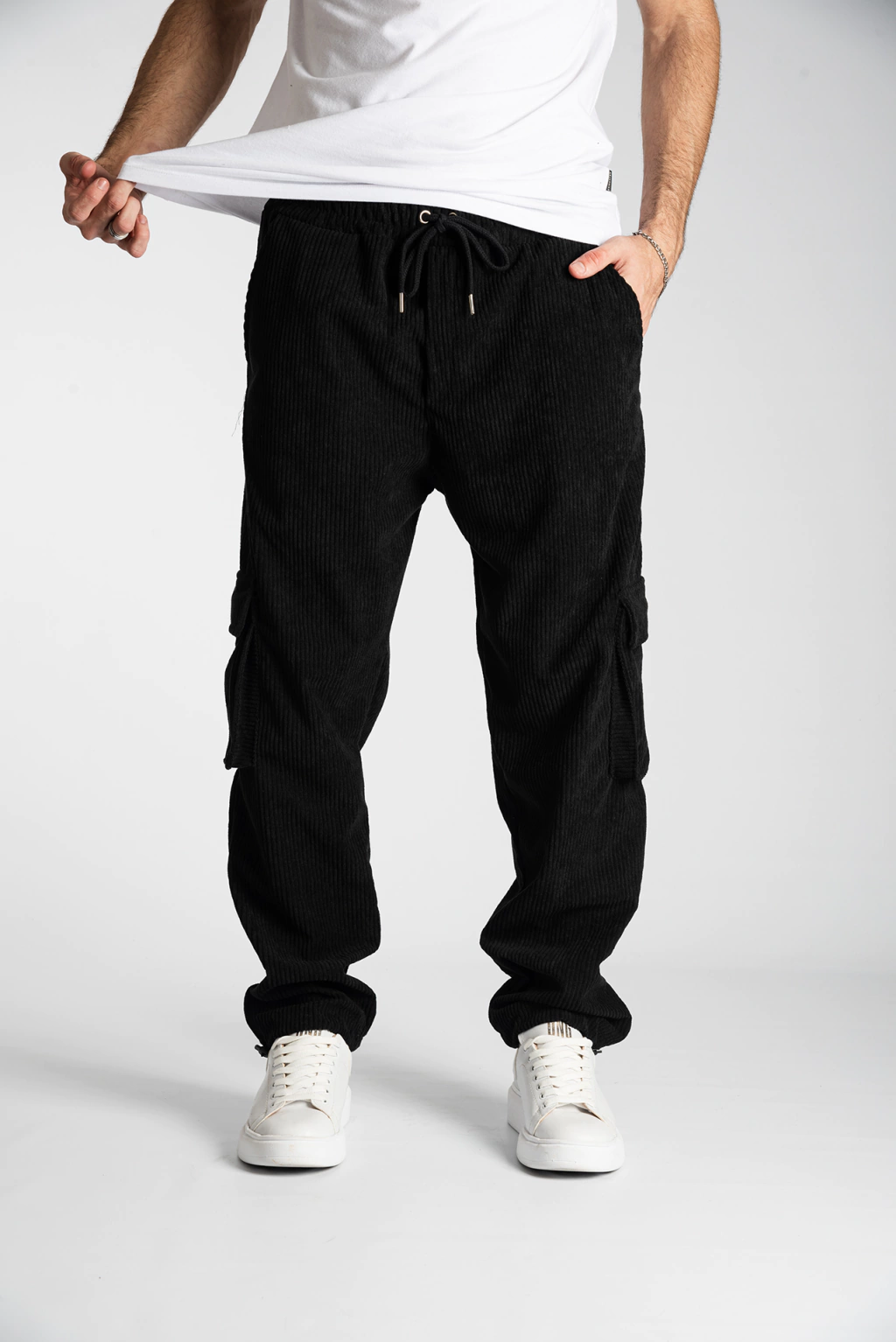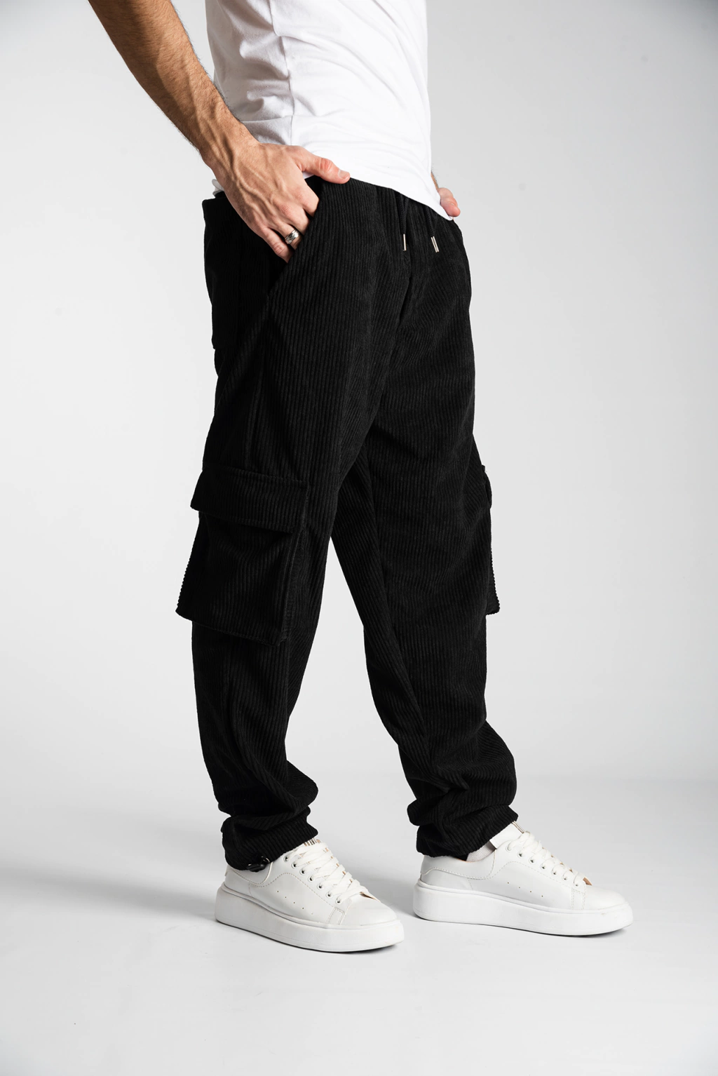 Pantalón de corderoy cargo, de color negro intenso. Viene con elástico a la cintura y cordón para ajustarlo a la medida deseada. Tiene regulador en la terminación del pantalón. De corte holgado. Es muy cómodo de usar y viste muy bien. Tu próximo pantalón favorito!